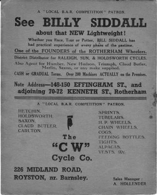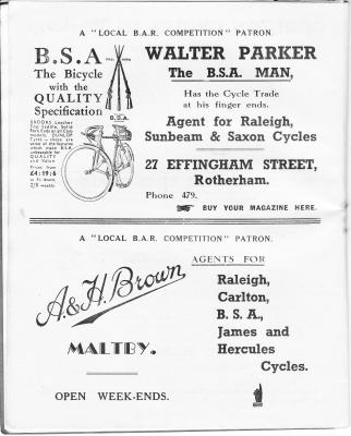 The Rotherham Wheelers was founded at the White Swan Inn, College Road, Rotherham in 1920. The club soon developed into one of the most noted in the area. Founder member H.C (Cliff) Henderson was a long standing President, still active in the 1970’s. He along with Wilf Ball soon had the club on the map with their racing skills. Cliff won the first Club 50 in 1920 with a time of 2h 28m 51s. Wilf was the Club Champion in 1930 & 1931. He won the Club 50 in 1929; Club 12hr 1928/29/30/31/33/ and won Newark and back in 1928/29/30/31/33. Wilf also being a printer, produced a magazine called The Wheeler in the 1920s. This was distributed around many counties by club members of other clubs and the members of those days had some very weird stories to tell.